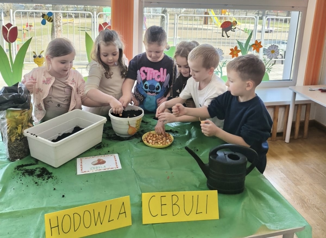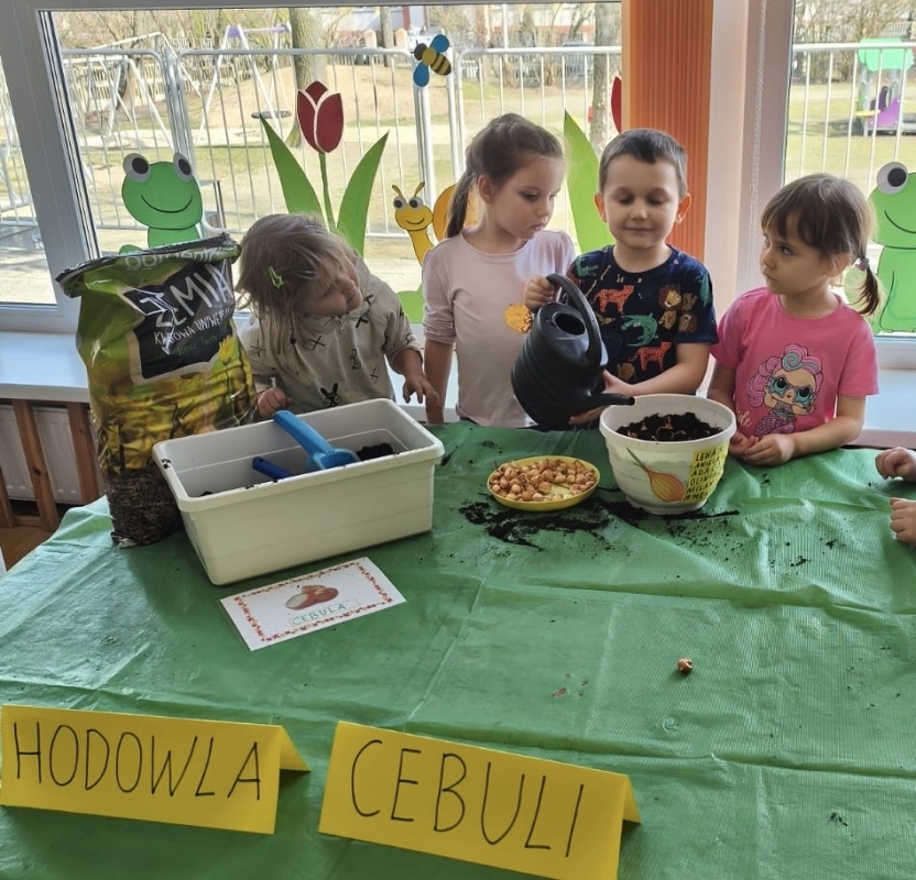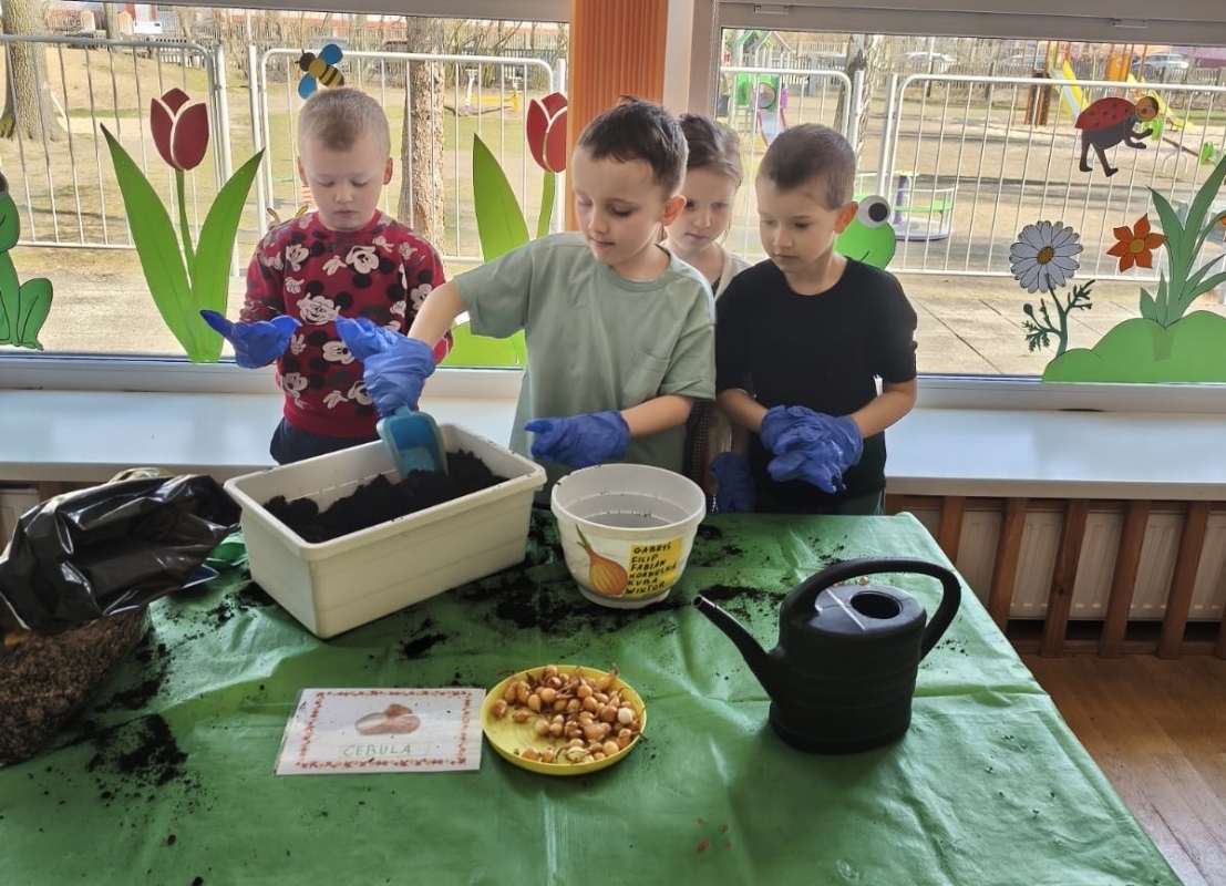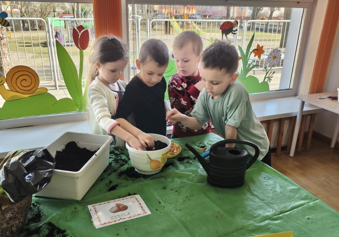 Wraz z nadejściem wiosny nasze przedszkolaki posadziły cebulę. Przed przystąpieniem do pracy dzieciaki poznały etapy wzrostu roślin cebulkowych oraz dowiedziały się, co jest potrzebne roślinom by urosły.